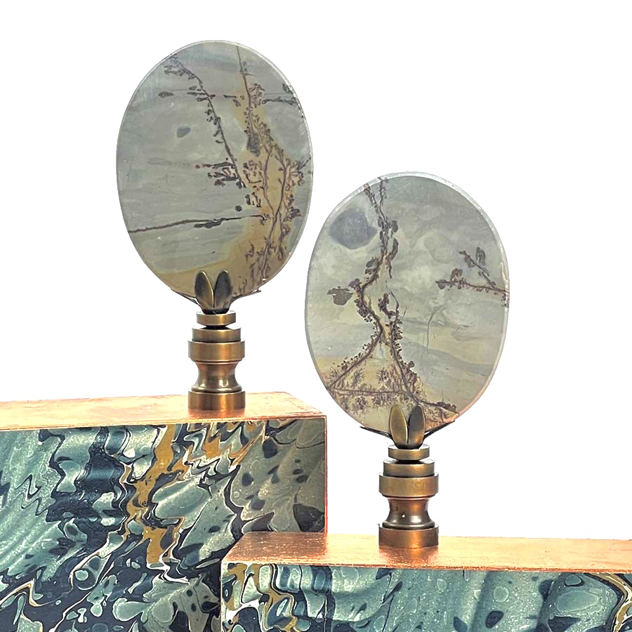 Dendritic Jasper Finials – Pair, also known as picture stone. The jasper is sliced, polished and the design is there from nature, the stones look as an artist has drawn a landscape. These measure 3.5″ tall mounted on antique brass bases.