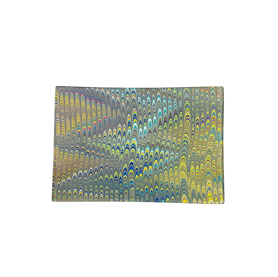 Hand made marble paper decoupaged glass tray. Decoupage is the art of gluing paper under glass. Each one capturing the ancient art of marbling. Do not submerge in water, wipe clean with a damp cloth. Backside is finished with marble paper and signed, each one will be slightly different. The glass is hand blown in the USA. 4″ x 6″