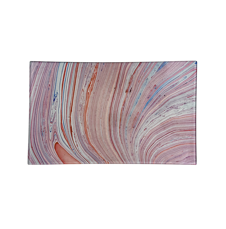 Hand made marble paper decoupaged glass tray. Decoupage is the art of gluing paper under glass. Each one capturing the ancient art of marbling. Do not submerge in water, wipe clean with a damp cloth. Backside is finished with marble paper and signed, each one will be slightly different. The glass is hand blown in the USA. 5″ x 8″