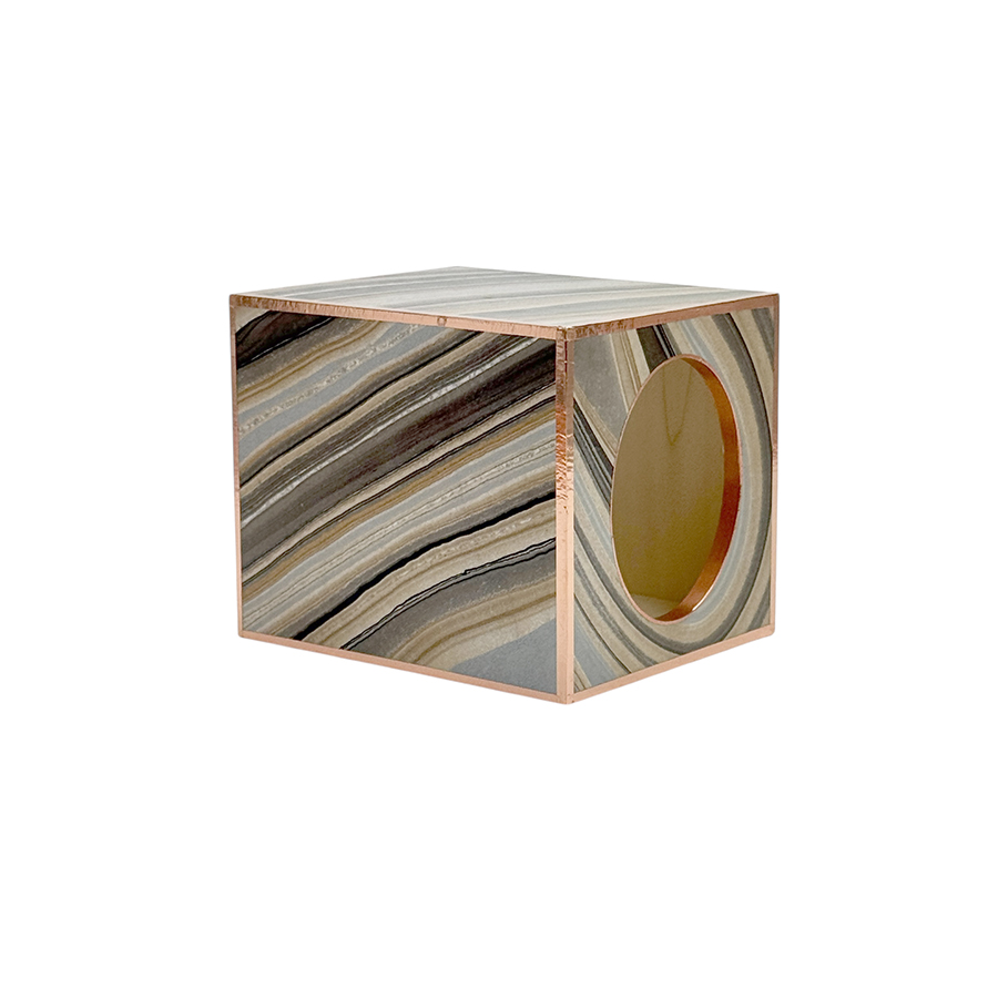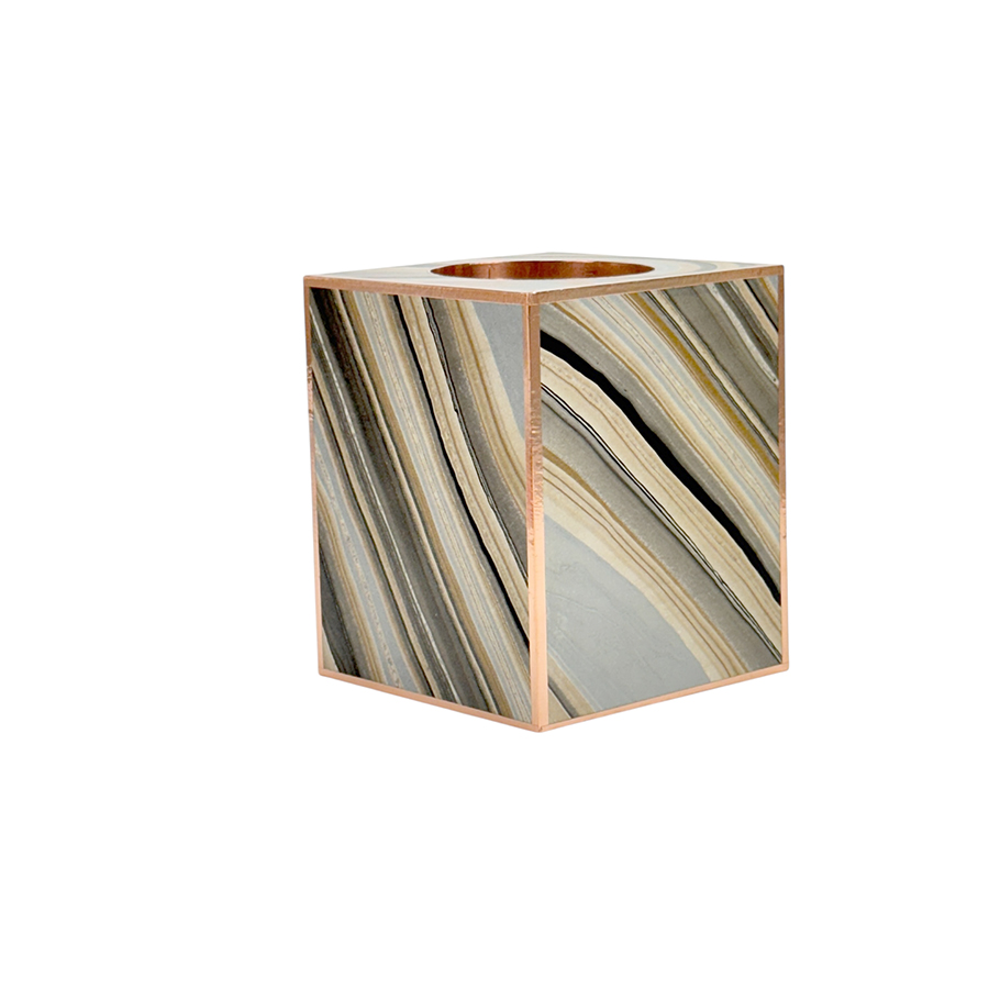 Marble paper, one of a kind, copper, wood and sealed, each box hand made to cover those not so pretty cardboard tissue boxes, making putting tissues anywhere in the house will make you smile. They measure 5.75″ x 5.25″ fit standard square tissue boxes.