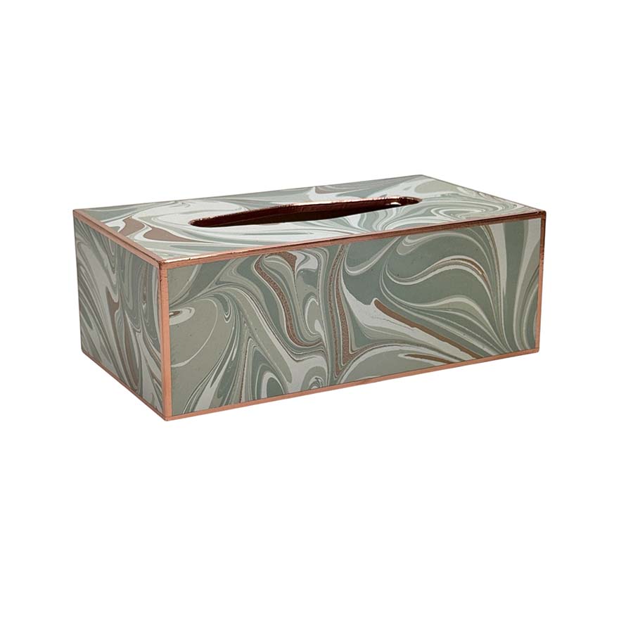 Marble paper, one of a kind, copper, wood and sealed, each box hand made to cover those not so pretty cardboard tissue boxes, making putting tissues anywhere in the house will make you smile. They measure 10″ x 5 5/8″ x 3 5/8″ fits standard large tissue boxes, not the xtra large tissue boxes.