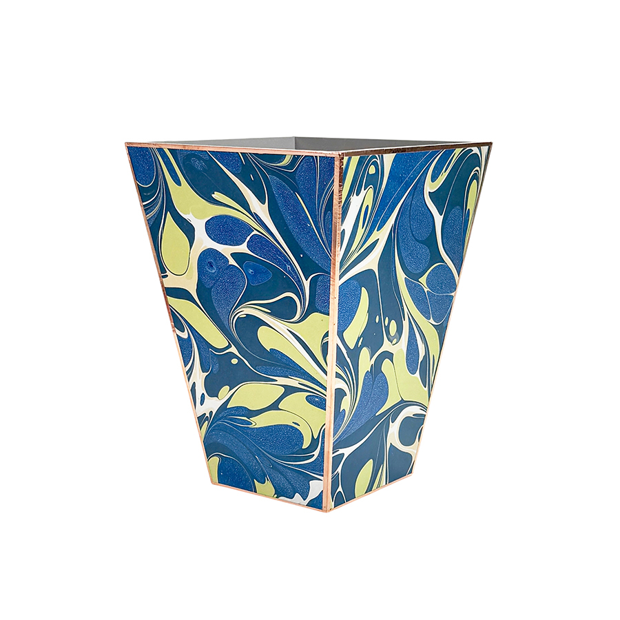 Marble paper, each one of a kind, copper and wood made into wastebasket. Measuring 8″ x 4.75″ x 11″ tall.